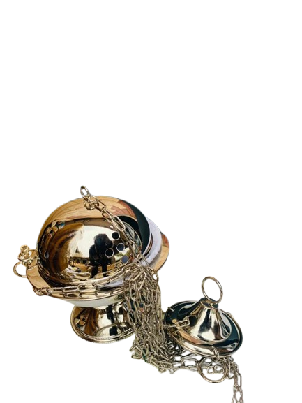 Round Thurible: In Gold and Silver. This Round Thurible is a beautifully designed censer used for the reverent offering of incense during Holy Mass, Benediction, and other sacred ceremonies. Its classic round shape represents wholeness and eternity.